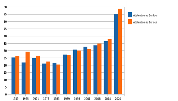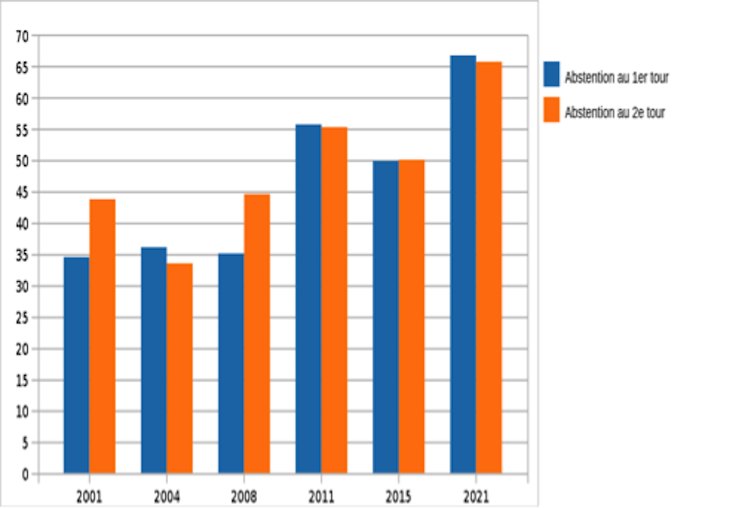 Il ne faut cependant pas négliger les explications conjoncturelles, comme ont le voit sur les pointes abstentionnistes aux régionales et municipales de 2020-2021, dans un contexte de pandémie. Les évolutions institutionnelles peuvent aussi avoir de l’influence, comme le montre le taux d’abstention pour les législatives : à partir de 2002, elles se déroulent toujours dans la foulée de l’élection présidentielle.
