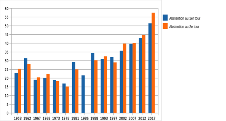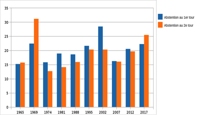 L’abstention était au contraire traditionnellement plus faible pour les présidentielles, les législatives et les municipales. Cette grande différence dans les niveaux d’abstention montre que la mobilisation des électeurs dépend beaucoup des enjeux perçus de l’élection. L’élection présidentielle reste l’élection la plus disputée, celle qui mobilise le plus les électeurs, au point que, au vu du graphique ci-dessous, on peut discuter d’une tendance haussière pour ce scrutin, même si elle semble effective à partir de 2007 qui constituait un des taux les plus bas de la Ve République. L’élection a connu ses pointes abstentionnistes les plus fortes en 1969 et 2002.