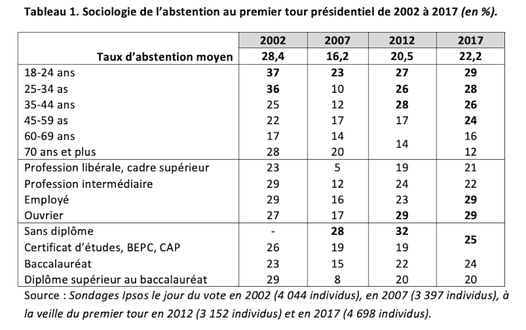 Pour progresser dans les explications de l’abstention, il faut aussi considérer sa sociologie. Les enquêtes et sondages permettent d’observer de fortes logiques sociales et politiques pouvant l’expliquer (tableau 1).