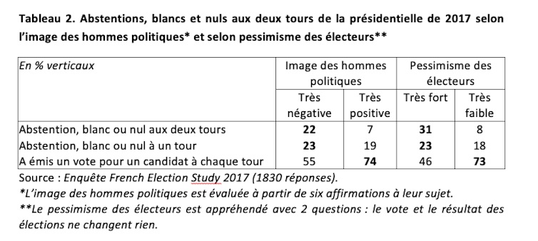 Si on est très critique à l’égard des élites politiques et pessimiste sur le changement que peuvent apporter les élections, on a aussi davantage de chances de s’abstenir (tableau 2), sans que cette relation soit très forte, ce qui montre que certains, tout en critiquant la classe politique et en ne croyant pas à des changements positifs pouvant advenir selon le résultat de l’élection, estiment qu’il y a quand même un candidat valable ou moins mauvais que les autres.