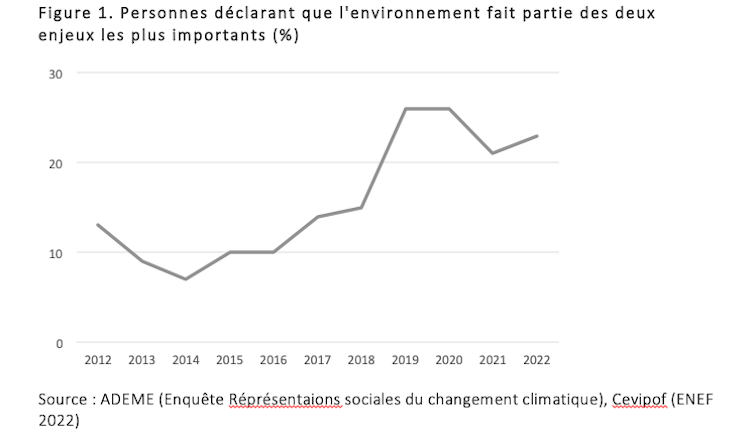 Le souci de l’environnement fait partie du quatuor de tête des enjeux les plus importants depuis quatre ans. Selon l’enquête Fractures françaises de 2021, le constat selon lequel le réchauffement climatique est dû à l’activité humaine et largement partagé (68 % des personnes interrogées). Quatre personnes interrogées sur cinq désirent que le gouvernement « prenne des mesures rapides et énergiques pour faire face à l’urgence environnementale », même si ces mesures exigeraient des modifications dans les modes de vie des citoyens.