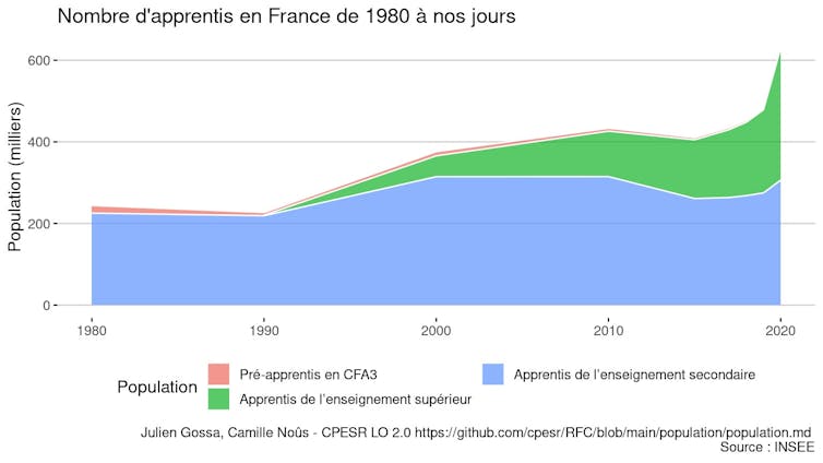 Bien que peu discuté, l’apprentissage émerge comme un sujet clivant, pouvant servir de boussole électorale. Propulsé notamment par la loi du 5 septembre 2018 « pour la liberté de choisir son avenir professionnel » puis le plan « #1jeune1solution » avec une aide spéciale le rendant pratiquement gratuit pour l’employeur la première année, l’apprentissage décolle brutalement : on se dirige vers un triplement de l’alternance dans le supérieur en quelques années seulement.