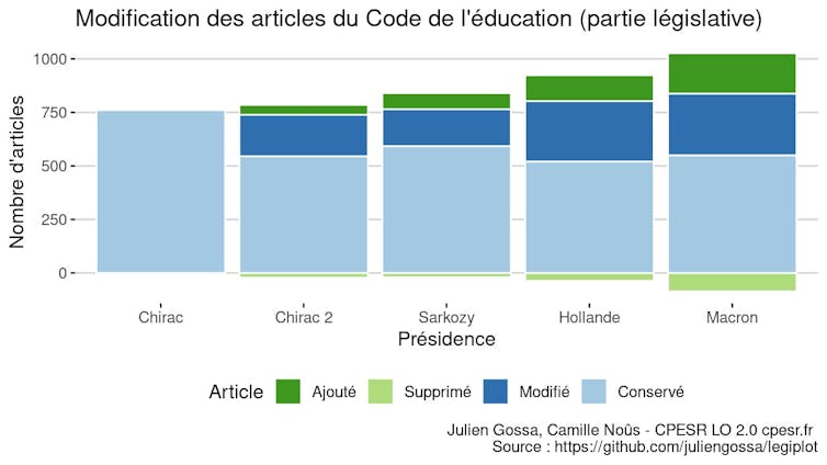 Le droit de l’éducation a été codifié en 2000, et sa partie législative comptait 761 articles. Un tiers de ces articles ont été modifiés, ajoutés ou supprimés durant la deuxième présidence de M. Chirac, puis de nouveau un tiers durant celle de M. Sarkozy, plus de la moitié sous M. Hollande, et enfin plus de 60 % durant le mandat de M. Macron. Malgré l’annonce faite en début de mandat, la partie législative du code de l’éducation compte maintenant plus de 1000 articles.