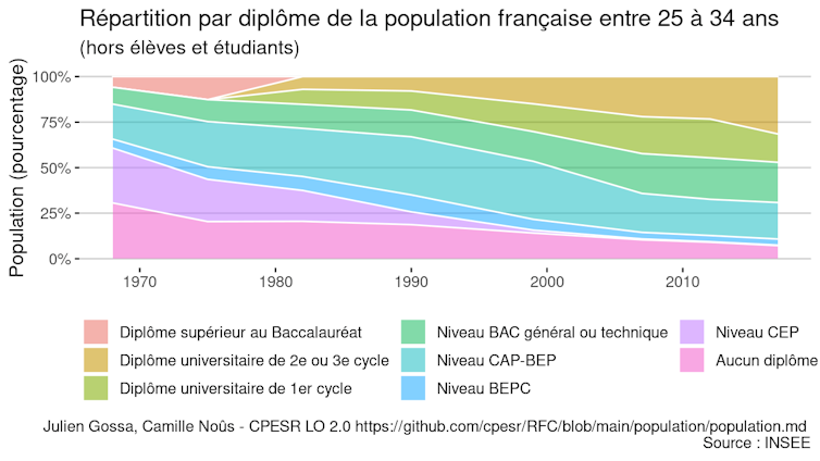 L’Université française actuelle a été conçue et structurée à la fin des années 1960, avec pour mission centrale de porter la massification ou démocratisation, c’est-à-dire de supporter la montée globale en qualification et formation de la population. Ainsi, alors que, à la fin des années 1960, 5 % des jeunes disposaient d’un diplôme supérieur au baccalauréat, ils sont pratiquement une moitié aujourd’hui, deux tiers si on compte le baccalauréat et 80 % si on compte CAP et BEP.