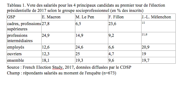 Loin de la disparition totale de tout « vote de classe », on observe encore des différences importantes en matière d’orientation de vote selon le groupe socioprofessionnel auquel appartiennent les électeurs. Ainsi, en 2017, selon la French Election Study, 27,8 % des cadres ont voté Emmanuel Macron au premier tour de l’élection présidentielle contre respectivement 12,6 % et 12,3 % des employés et des ouvriers (voir tableau 1). De même, seuls 6,5 % des cadres ont voté pour Marine Le Pen contre 24,6 % des employés et 25 % des ouvriers. Ces différences ne sont toutefois pas toujours significatives, notamment si on tient compte du sexe, de l’âge, du niveau de diplôme et des autres caractéristiques socioprofessionnelles des répondants.