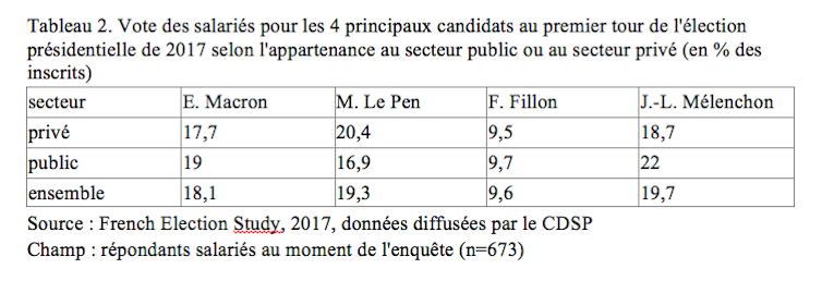Ainsi, en 2017, 22 % des salariés du public ont voté Jean-Luc Mélenchon contre 18,7 % de ceux du privé. À l’inverse, seuls 16,9 % des salariés du public ont voté pour Marine Le Pen contre 20,4 % de ceux du privé (voir tableau 2). Cela peut s’expliquer par leurs identités professionnelles spécifiques ou encore par la présence syndicale plus importante dans le secteur public. Les écarts relativement réduits tendraient toutefois plutôt à accréditer la thèse d’un brouillage du clivage entre salariés du privé et du public, du fait notamment de la diversification des statuts dans le secteur public, de l’affaiblissement des identités professionnelles ou encore de la moindre conflictualité sociale.