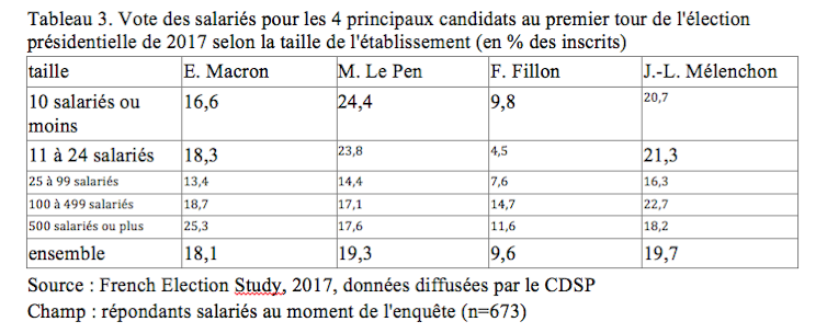 Une autre relation a été plus récemment documentée, notamment à l’échelle européenne par Christoph Arndt et Line Rennwald, entre la taille des établissements de travail et l’orientation du vote. Les salariés des petits établissements voteraient davantage que le reste des salariés pour la droite et l’extrême droite. On retrouve ce résultat en France : en 2017, 24,3 % des salariés d’établissements de 10 salariés ou moins et 23,8 % des salariés des établissements de 11 à 24 salariés ont ainsi voté pour Marine Le Pen contre 19,3 % de l’ensemble des salariés (voir tableau 3). Selon ces auteurs, cette relation s’exppiquerait par la plus faible syndicalisation dans les petits établissements, par une satisfaction au travail plus importante, par un climat social moins tendu et par des relations entre employeurs et employés basées sur la proximité et l’informalité.