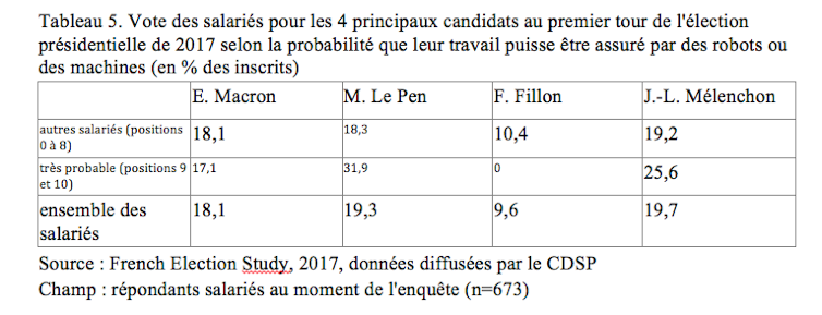 S’il est difficile de reproduire cette analyse à partir d’enquêtes post-électorales, les conditions de travail des répondants n’étant pas toujours finement documentées, on peut toutefois observer que, en 2017, les salariés considérant comme très probable que leur travail puisse un jour être assuré par des robots ou des machines (positions 9 ou 10 sur une échelle de 0 à 10, soit 7,7 % des répondants salariés) sont bien plus nombreux que l’ensemble des salariés à avoir voté pour Marine Le Pen (31,9 % contre 19,3 %) ou même pour Jean-Luc Mélenchon (25,6 % contre 19,7 %) (voir tableau 5).